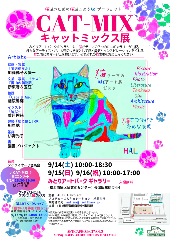 横浜市を拠点とするアート プロジェクト AETICA Projectは、2019年9月14日から16日の3日間、横浜市緑区民文化センター(みどりアートパーク ギャラリー)にて、猫をテーマに多彩なアート表現を展開するミックスアートイベント「CAT-MIX(キャットミックス展)」を致します。